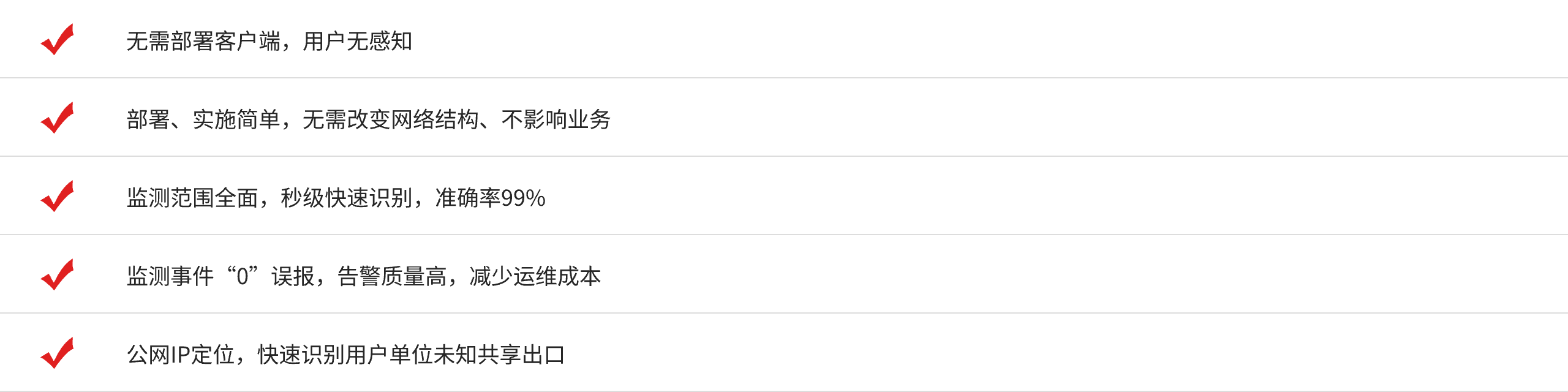 结合海量知识库,包括报文规则库、主机状态库等,设置检测规则自动适配网内业务应用,完成违规行为检测,对网内业务应用无影响。